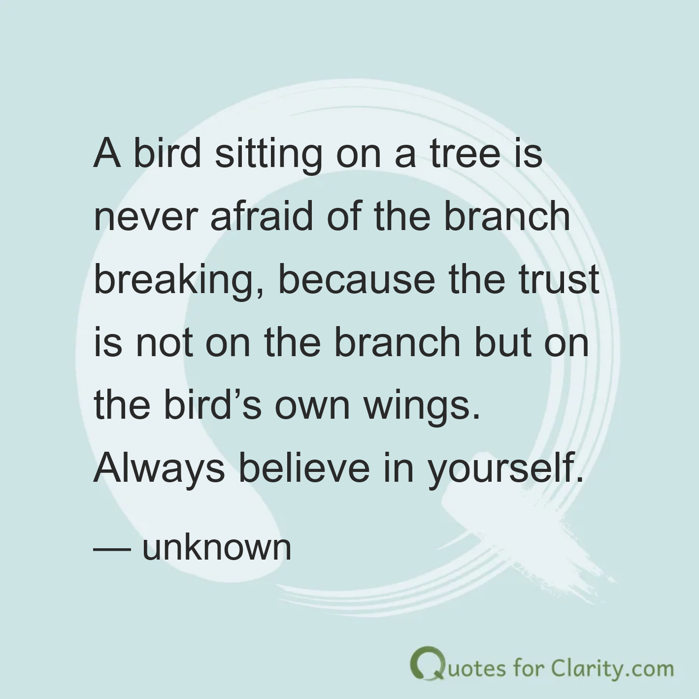A bird sitting on a tree is never afraid of the branch breaking, because the trust is not on the branch but on the bird’s own wings. Always believe in yourself.