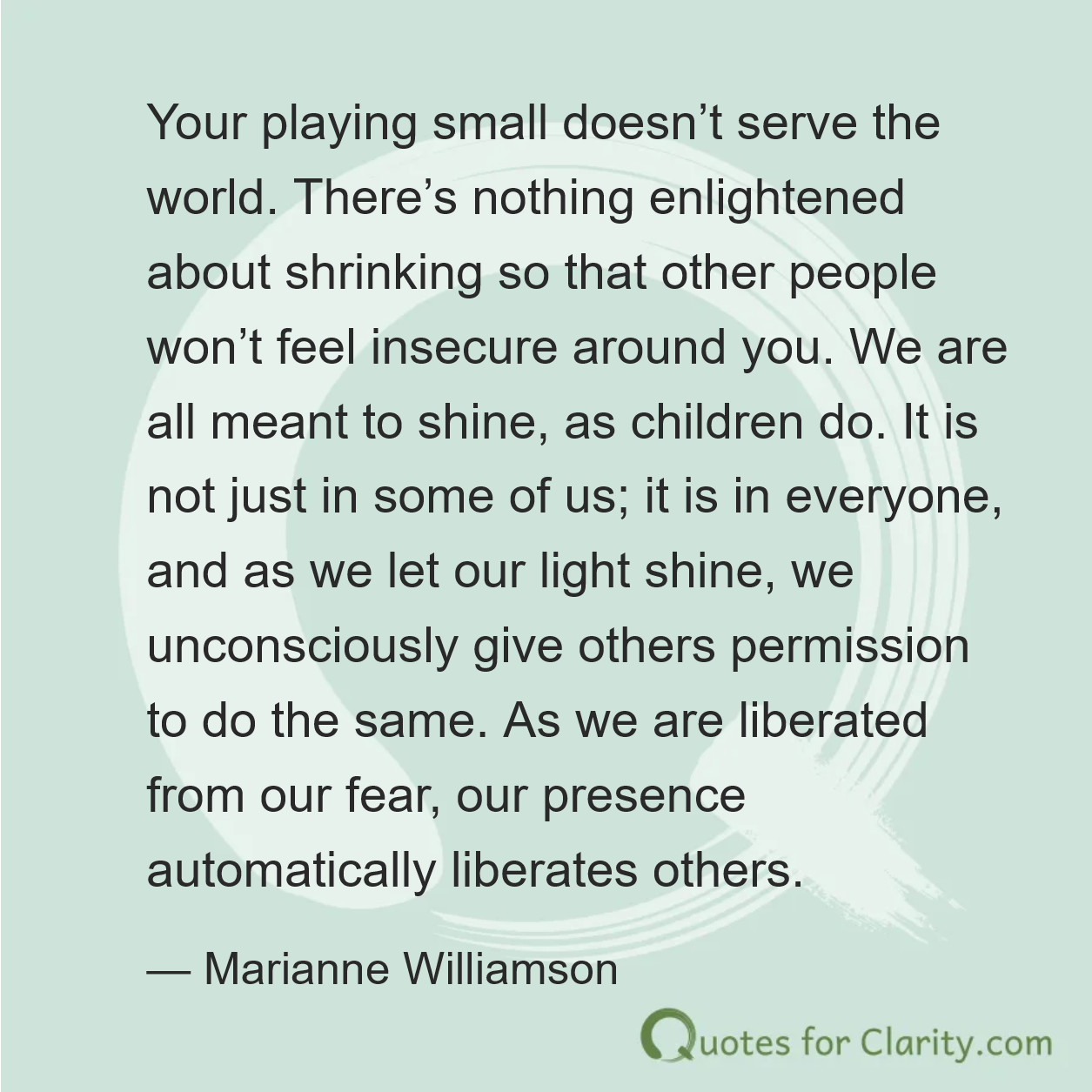 Your playing small doesn’t serve the world. There’s nothing enlightened about shrinking so that other people won’t feel insecure around you. We are all meant to shine, as children do. It is not just in some of us; it is in everyone, and as we let our light shine, we unconsciously give others permission to do the same. As we are liberated from our fear, our presence automatically liberates others.